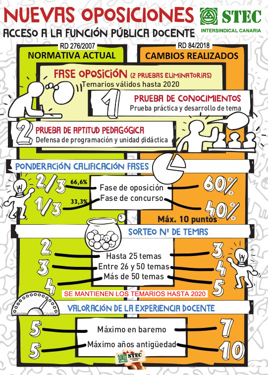 Tras la aprobación del Real Decreto 84/2018, de 23 de febrero, por el que se modifica el Real Decreto 276/2007, de 23 de febrero, por el que se aprueba el Reglamento de ingreso, accesos y adquisición de nuevas especialidades en los cuerpos docentes a que se refiere la Ley Orgánica 2/2006, de 3 de mayo, de Educación, y se regula el régimen transitorio de ingreso a que se refiere la disposición transitoria decimoséptima de la citada ley., las modificaciones en las oposiciones podéis ver cómo quedaron en esta buena infografía realizada por STEC: