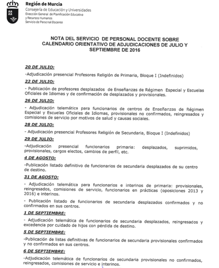 La Consejería de Educación acaba de publicar el calendario de actuaciones previstas de cara al inicio del curso 2016/2017: