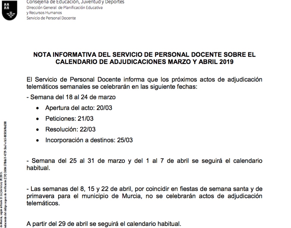 La Consejería de Educación publicó una nota informativa sobre las adjudicaciones previas y posteriores a la Semana Santa y Fiestas de Primavera de Murcia: