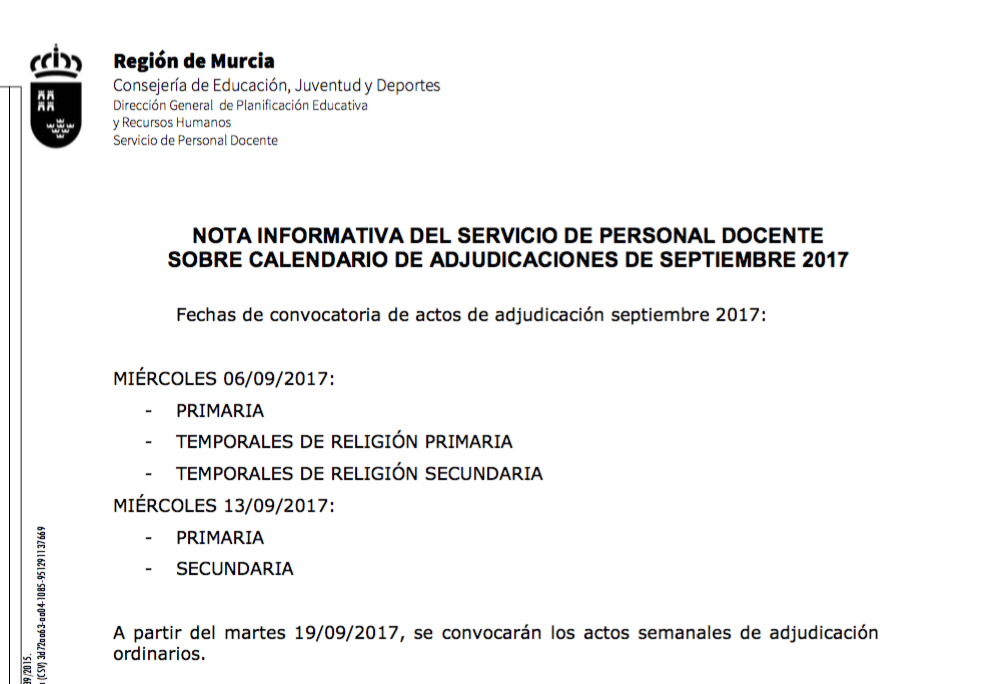 Calendario de Adjudicaciones de interinos del mes de septiembre