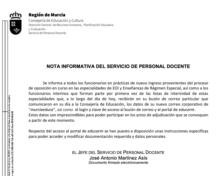Tanto los funcionarios en prácticas como los interinos que forman parte de las listas de interinidad por primera vez de EOI y Enseñanzas de Régimen Especial recibirán, a lo largo del día de hoy en su buzón de correo particular que comunicaron en su día a la Consejería de Educación, los datos de su nuevo correo corporativo de “murciaeduca”, así como el login y clave de acceso al buzón de correo y al portal de educarm.