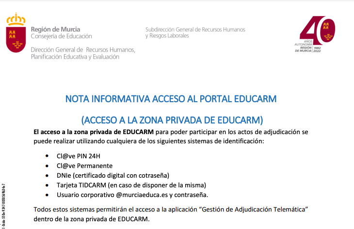 La Consejería de Educación ha publicado una nota informativa referente al acceso a Educarm de funcionarios e interinos de Secundaria.