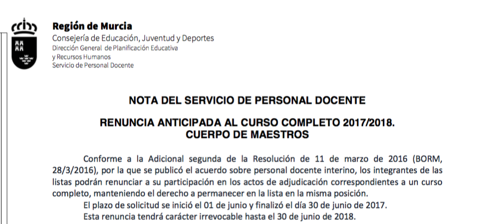 La Consejería de Educación ha publicado los listados de interinos de Primaria y Secundaria, que solicitaron la renuncia anticipada al curso completo 2021/22 o al primer trimestre: